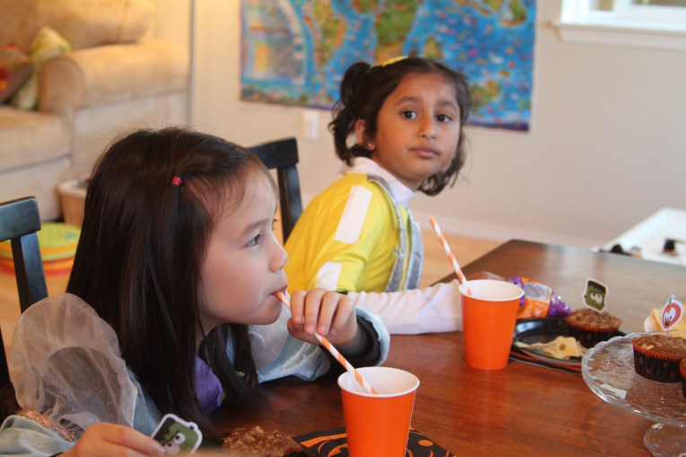 These cuties put together crafts, played Pin the Hat on the Witch, and danced and munched to their hearts’ content. (I didn’t get a picture of the wild & witchy dancing and the spooktacular story time.) Luckily I had a good friend with me to make the party just as fun for the moms! I love this tradition and I already can’t wait for next year’s party!